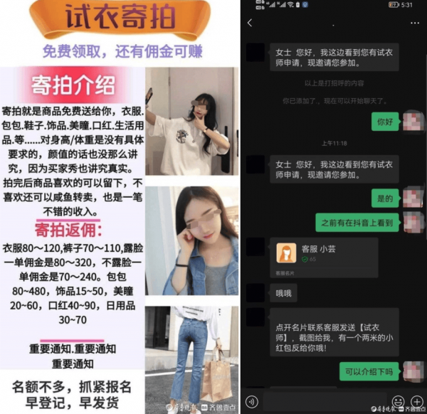 喜欢拍照、爱美的容易被试衣模特吸引。齐鲁晚报记录过一则案例,宝妈赵美在看小孩的间歇刷短视频,看到了试衣寄拍的招聘:"衣服、包包、鞋子、视频、美瞳、口红……寄拍商品免费送,只需留下买家秀,每单返80-320佣金"。