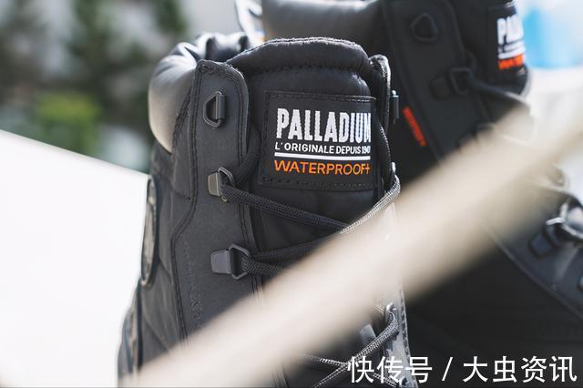 鞋舌同样使用防水材质布料,顶端缝制上PALLADIUM帕拉丁与橘标防水的标志。