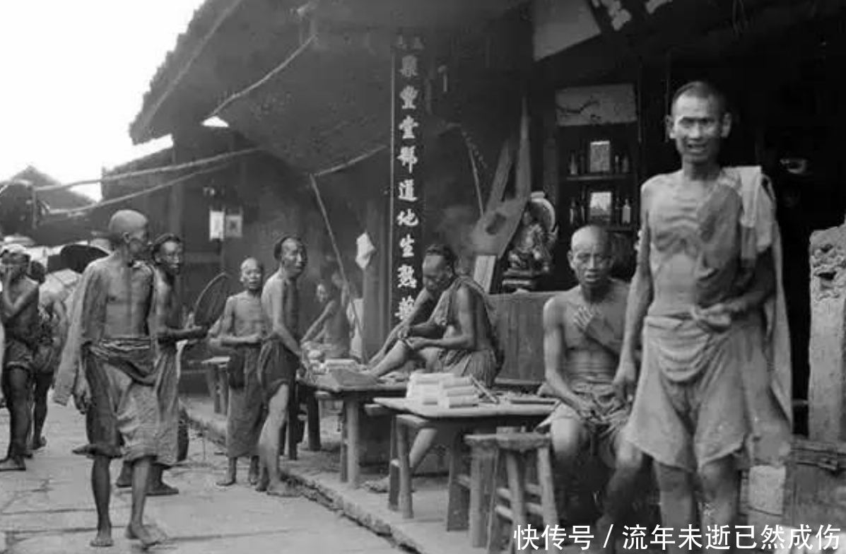 图为一组清末民初的社会景象老照片,这些老照片至今已有百年之余,虽然影像看起来比较模糊,但是依旧能为我们呈现还原一个当时的真实历史。这是晚清末年的四川遂宁县城大街上的场景,这些大部分是晚清穷人,他们面黄肌瘦萎靡不振。