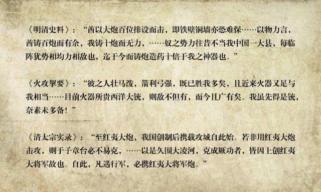 后金军队在加紧仿制火炮的同时,也从明军降将处得到了大量的火炮补给。在大凌河战役中,后金军队就曾经缴获过大量明军火炮,而在天聪七年到天聪八年,明朝将领孔友德、耿仲明、尚可喜先后投降后金,他们不仅带去了大量的军队,还将火炮作为封官晋爵的最好踏板而进献给后金,使得后金军队的火炮数量和质量迅速接近甚至超越了明军,这在之后的松锦大战中成为了后金军队致胜法宝之一: