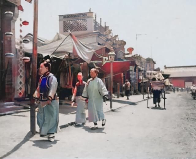 图5:清朝老百姓上街的照片,那时候的街上比较冷清,没有多少商贩在摆摊,不过有人力拉车。