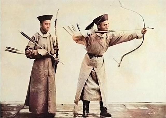 图2:清朝老照片:图为清朝末年的八旗弓箭手,前面的将士拉到满弓,想来武艺十分高强,此时欧洲已进入工业革命,开始建造枪支,清朝已经十分落后