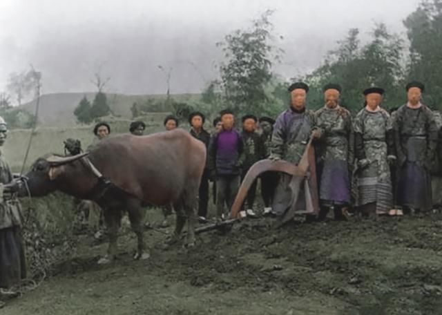 图4:官员们在视察民情,手扶着犁合影留念。真正的农民被牛挡着站在后面。