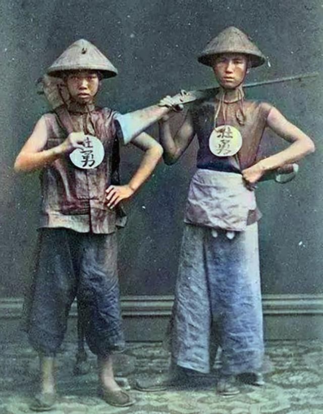 图3:骨瘦如柴的清兵叉着腰,他们头戴草帽,持枪持刀的姿势不专业,还叉着腰,看着很懒散。清兵制服上写着"壮勇"二字,很讽刺,谈何保家卫国?