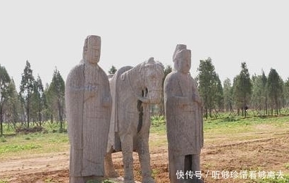 宋代文官以宰相为首,武官以枢密使为首,上朝排列次序文官在武官之上,因而陵墓石刻中文臣像居北、武臣像位南。石象中的文、武臣服饰相同,其区别仅在文臣执笏板、武臣拄长剑。文武臣头戴三梁或五梁冠,身穿长袍,腰系方块玉带。图中是拄长剑的武官石像。 ?