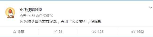 14点53分,该网友再次更新动态,“因为和父母的家庭矛盾,占用了公安警力,很抱歉。 ”
