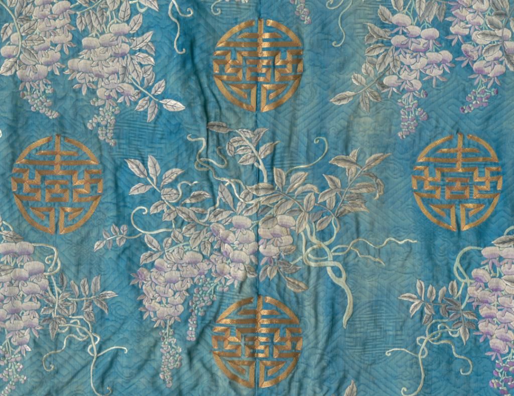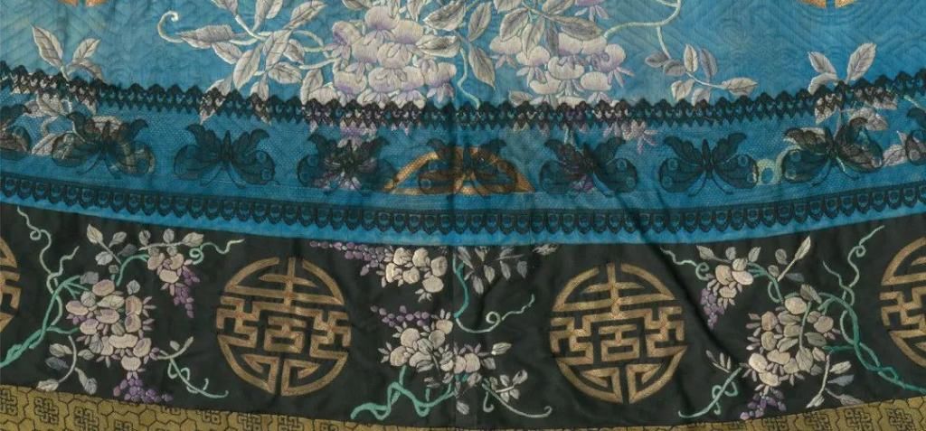 衣服上面有彩绣的紫藤花图案和盘金绣的团寿纹样,尤其特殊的是在衣襟和下摆边缘,还镶有一圈黑色的蝴蝶纹蕾丝。