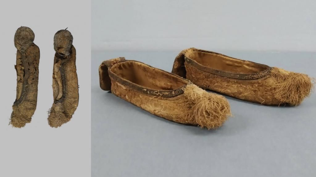 慈禧脚上穿着的绣花鞋,原本在鞋身与提跟的地方,用堆绫绣的方式绣满了荷花,鞋头装饰了缨穗,以万字曲水纹锦镶边,非常精致。修复师拿到手的时候,只剩下了一个破破烂烂的鞋面,他们自己给补上了鞋底,才还原了鞋子的立体形状。