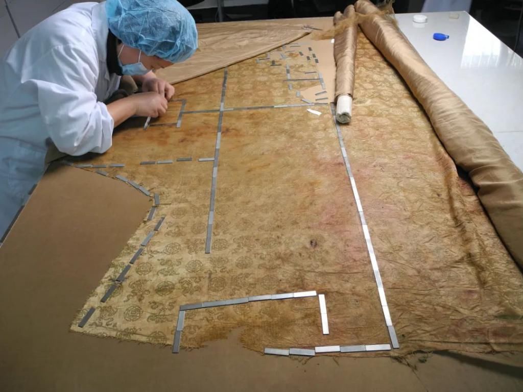 王淑娟介绍,清东陵的这批文物主要使用了物理修复,也就是采用和文物面料风格一致的面料,衬在文物破损部位的下面,通过相应的针法将背衬材料和文物缝合起来,相当于对文物做了整体加固。