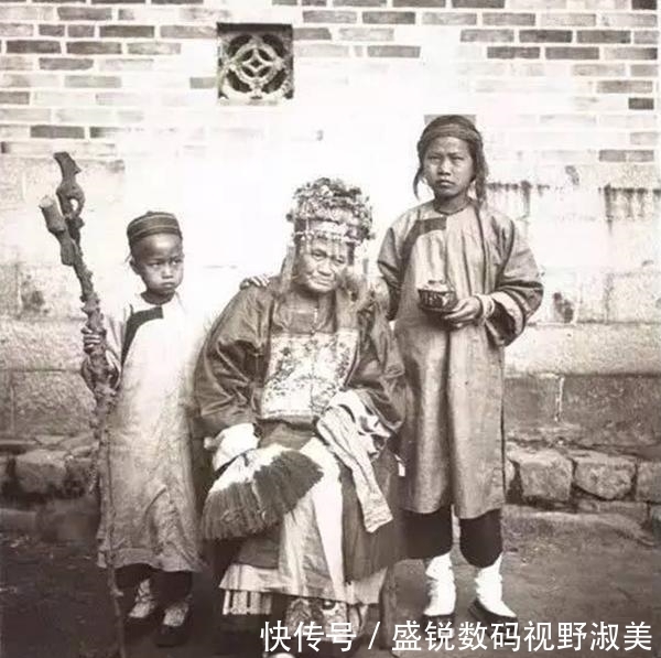 这是一位非常年迈的清末诰命夫人,身边的两位孩童是她的子孙,一个给她拿着拐杖,一个给她端茶。
