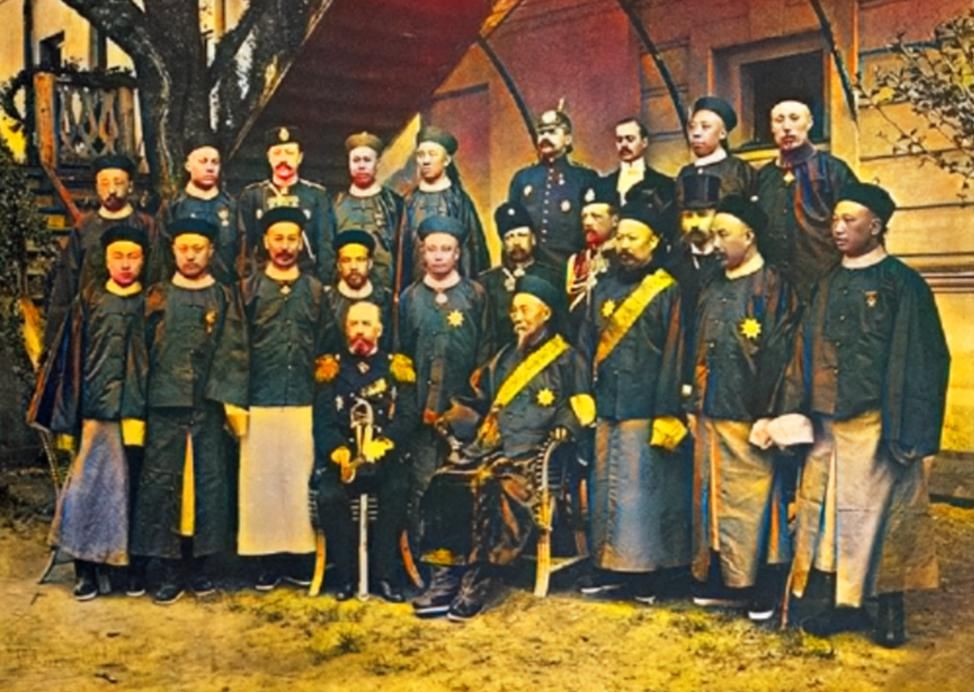 1896年5月,李鸿章抵达莫斯科参加庆祝尼古拉斯二世皇帝和亚历山德拉·费奥多罗夫娜皇后加冕典礼。其后,尼古拉斯二世皇帝与参加加冕的外国领导人及高级官员合影。李鸿章的使团团队规模宏大。一眼望去以为是自己接见自己。