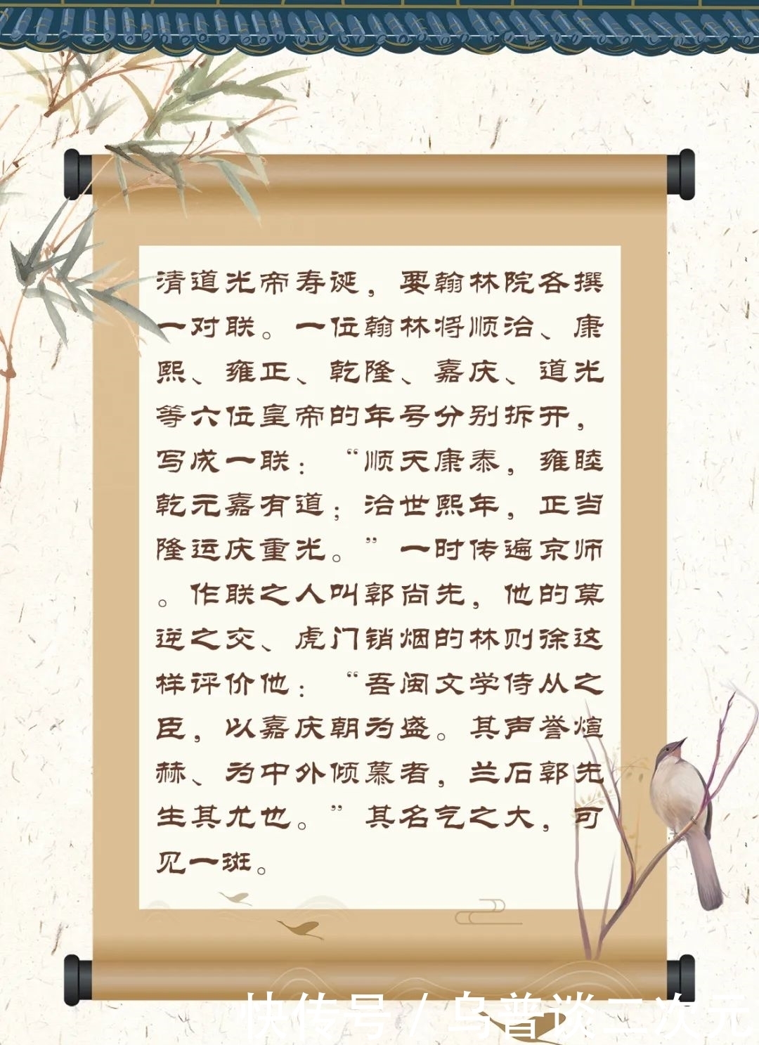 郭尚先(1785-1832),字元开,号兰石,又号伯抑,福建莆田人,嘉庆十四年(1809)中进士,授翰林编修。十八年(1813),充贵州乡试正考官。二十年(1815),升国史馆纂修、文颖阁总撰,参与修撰《治河方略》、《大清一统志》等。后任云南乡试正考官、广东乡试副考官。道光八年(1828)任四川学政,年底抵成都。道光十一年(1831)回京。道光十二年(1832),升任大理寺卿(掌管全国刑狱的最高长官,正三品),秋季又升任礼部右侍郎(从二品)。