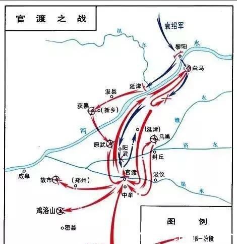 建安五年(200年)的二月,袁绍派郭图和颜良进攻曹操的东郡太守刘延,地点是白马,这就是著名的白马之围。袁绍后来率军赴黎阳,准备过黄河。 4月,曹操亲自率军营救了刘延。曹操按照荀攸的建议,采取了声东击西的的战术,以分散袁绍的力量,即先率军到达延津,伪装渡河,攻击袁绍的后方,使袁绍分兵向西,然后派出轻骑兵迅速袭击了攻击白马的袁军。曹操接受了这个建议,袁绍真的将部队分为了延津。曹操派张辽和关羽作为前锋冲向白马,袁绍大将颜良惊慌失措被关羽斩于阵中。曹操算是解了白马之围,迁徙了民众,并沿黄河向西撤退。袁绍率军渡河追击到达延津以南。在白马以南南阪这个地方,大将文丑赶上了曹军。曹操再次接受了荀攸的建议,故意丢掉了辎重,让袁军的士兵来抢。曹军趁机发动了进攻,击败了袁军。大将文丑被杀。曹军成功返回官渡。