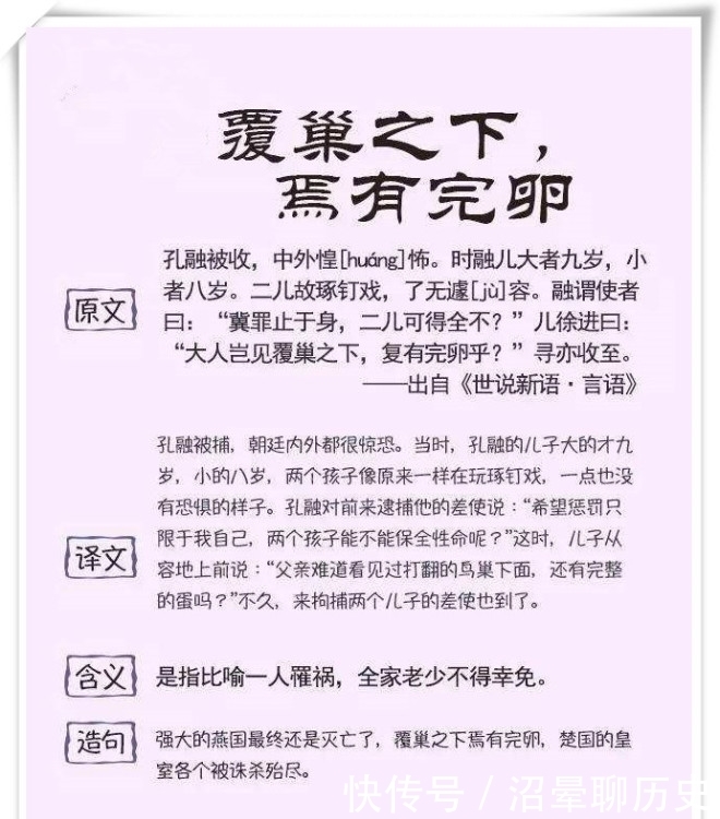 初,女年七岁,男年九岁,以其幼弱得全,寄它舍。二子方弈棋,融被收而不动。左右曰:"父执而不起,何也?"答曰:"安有巢毁而卵不破乎!"主人有遗肉汁,男渴而饮之。女曰:"今日之祸,岂得久活,何赖知肉味乎?"兄号泣而止。或言于曹操,遂尽杀之。及收至,谓兄曰:"若死者有知,得见父母,岂非至愿!"乃延颈就刑,颜色不变,莫不伤之。(《后汉书·卷七十·郑孔荀列传第六十》)
