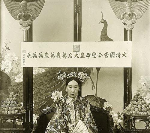 慈禧,即孝钦显皇后,叶赫那拉氏,咸丰皇帝的妃嫔,同治皇帝的生母。其实在咸丰皇帝死前,慈禧还只是懿贵妃,咸丰皇帝驾崩后,与慈安太后并尊,称圣母皇太后。慈禧作为清末中国的实际统治者,一生历经诸多大事,不仅心狠手辣,而且政治上更是精明无比。照片中慈禧手拿着折扇,正襟危坐,上面还有一行字写着:大清国当今圣母皇太后万岁万岁万万岁。