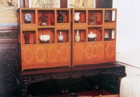 紫檀木镂空雕花炕几上,陈设着慈禧太后喜爱的文竹百宝柜,她一有空闲,就时常流连在柜前,展玩柜内的各种珍玩,包括各式精美的器玩、乾隆岁寒三友图青花玉壶春瓶一对、精美的珊瑚盆景和青玉雕进宝图盆。炕几下是临窗大炕,暗花明黄缎坐垫上,是慈禧经常把玩的画珐琅花鸟手炉和铜镀金嵌烧蓝镜表。
