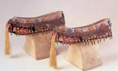 满族女人穿的是木制平底鞋和高底平头鞋,旗人所穿,人称旗鞋。平底鞋是方口,与朝靴相似,前头高高翘起。高底鞋是满族女人们最富于民族特色的鞋子,鞋底中部足心的地方垫一个高约10厘米的高底,外裱纳好的数层白布。这种鞋跟,分马蹄形、花盆形和元宝形三种。鞋口镶边,鞋面刺绣、堆绣各种花纹。慈禧身材娇小,极喜爱这种高底鞋,特别是花盆底和马蹄形女鞋。粉色缎绣竹蝶鲤鱼纹花盆底鞋和湖色缎绣折枝兰花纹马蹄鞋,造型别致,花色清纯,让她爱不释手。