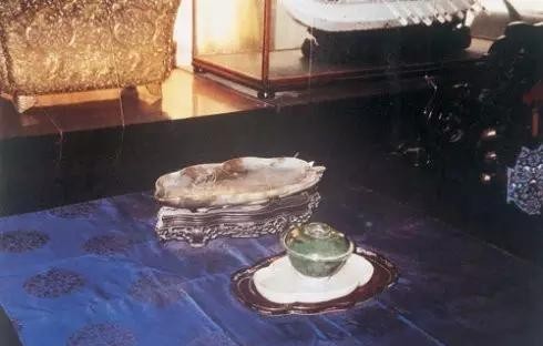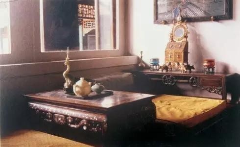 临窗炕沿上摆放着猩红洋毯,毯子上是紫檀木镶嵌螺钿石面炕桌和明黄坐垫。炕桌上摆海晏河清玉烛台和一个黑漆描金彩绘花鸟图案的长方漆盘,漆盘内摆放着白玉带盖茶壶、翠玉带盖玉碗。紧靠西墙,摆放一个紫檀木镂花带屉炕几,几上陈设着精美绝伦的梳妆匣、香水、粉盒、西洋钟。慈禧有时坐在这临窗的地方,看着窗外美丽的景色,喝着玉壶内的安徽六安瓜片茶,感觉十分惬意。
