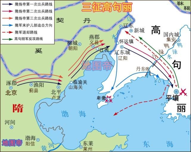 隋朝时,高句丽多次袭扰边境,隋炀帝在开凿完大运河、安抚东西突厥后,从612年开始,集结百万大军,连续三年三次御驾亲征高句丽。第一次出征惨败而回;第二次因杨玄感叛乱无功而返;第三次高句丽请降,遂班师回朝。三次大规模征战,使国力严重透支,百姓民不聊生,最终导致天下大乱。