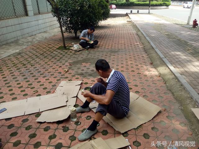 这几天虽然出伏了,但中午的天气依然很热,估计在30度开外,虽然走在树荫里,但还是冒了一身汗。突然发现几位民工大哥在前面席地而坐,感觉是正在吃午饭。小编走过去看看民工大哥都是吃的什么好饭。