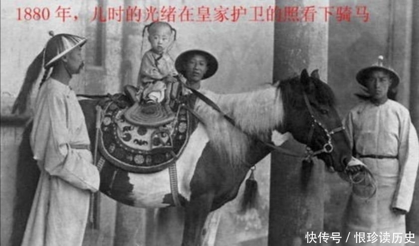 光绪帝幼年时的骑马照,拍摄于1880年。在宫中大内侍卫的守护下,稚气未脱,难得一见。他的父亲是醇亲王奕譞,生母叶赫那拉·婉贞为慈禧皇太后的亲妹妹,在慈禧的授意下四岁登基为帝。他在位三十四年,却是清王朝最命苦的皇帝,从下就在慈禧的淫威下长大。没有皇权,饮食起居都没有自由。最喜欢的妃子被慈禧沉井,戊戌变法后在中南海瀛台过了十年的幽禁生活!