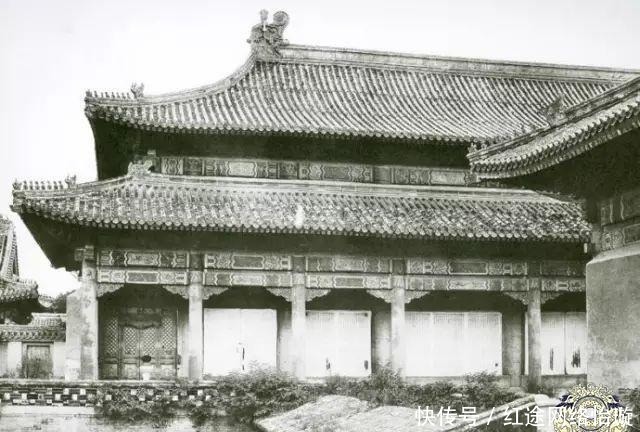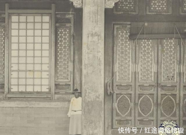 侍卫站在乾清宫前面。乾清宫是内廷正殿,在明清两代有16位皇帝将其作为寝宫,正好和坤宁宫成一阴一阳。乾清宫的正殿宝座上方悬着一个顺治亲笔书的"正大光明"匾,匾的背后藏有密建皇储的"建储匣"。从照片中可以看出,乾清宫门前柱子上的漆已经掉光了,大门的窗户纸还破了几个洞。