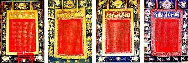 ▲ 龙凤锦幛四匹,从左到右分别为:道光十七年锦幛、道光二十一年锦幛、道光五年锦幛、光绪八年锦幛。四周都用彩线绣有祝寿图,各种花纹图案清晰可见,中间部分序文文字较多且笔画复杂。