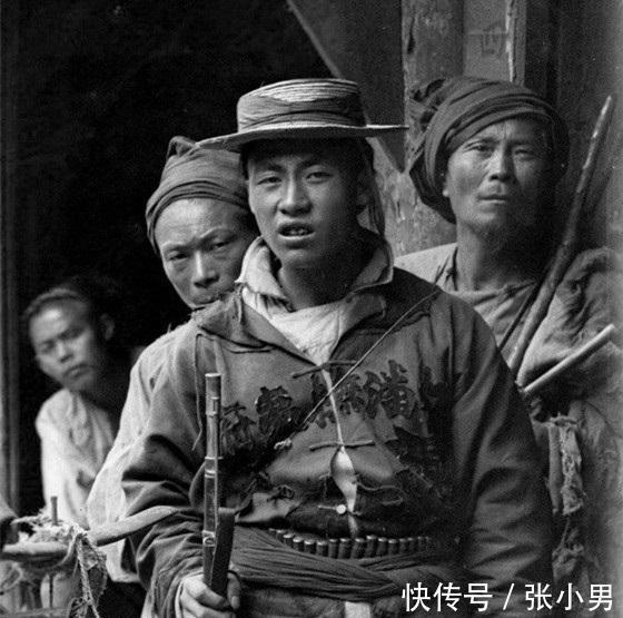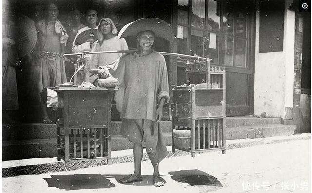 晚清罕见真实老照片:图为一位晚清男子挑着担子走街串巷卖小吃。