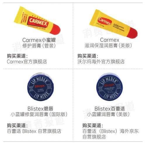 在此次检测的润唇膏中,知名度较高同时十分受消费者喜爱的Carmex、Blistex两款产品分别有两个版本,一种是在国内有进口备案的Blistex碧唇小蓝罐修复润唇膏(国际版)、Carmex小蜜媞修护唇膏(管装),在国内有代理商和官方旗舰店。