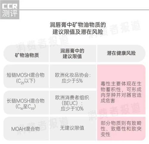 欧洲消费者组织(BEUC)在2017年11 月提出建议,认为润唇膏中所含的长链MOSH混合物(碳分子数量由C16至C35范围)应少于10%。