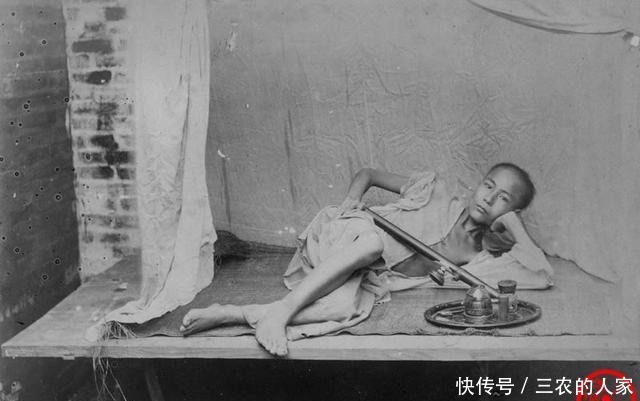 鸦片让人变得精神萎靡毫无力气,瘾君子多是躺着吸。他面前摆着吸食鸦片最基本的两件工具:烟灯和烟枪。