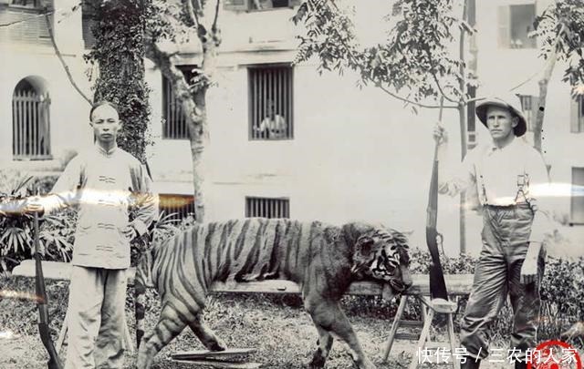 华南虎仅在中国有分布,是中国特有的虎亚种。晚清来华的洋人对此很感兴趣,常常捕猎。左边的中国人应该是当地的猎人。
