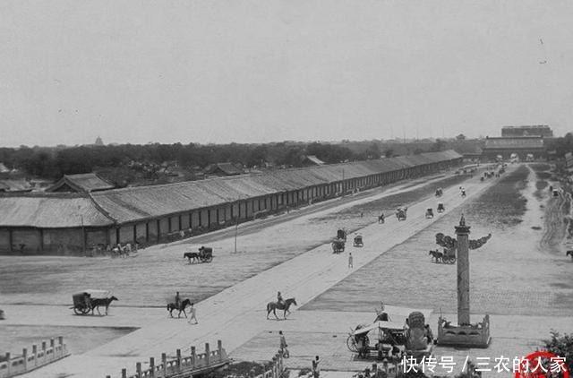千步廊是皇宫前御街两侧的廊庑,这里集中着一批朝廷机构的衙署,吏、户、礼、兵、刑、工六部就在此办公。在照片远处,能看到大清门,以及毁于庚子战火的前门城楼的残迹。
