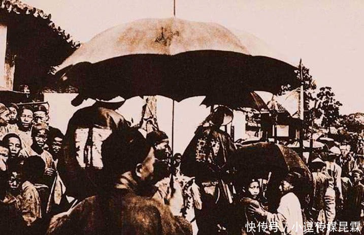 图为迎接云贵总督与云南巡抚时的照片,他们两人都是朝廷的一品大员、从一品大员,身份十分的尊贵,这从他们二人所打的洋布伞就可以看出来,因为在当时的昆明,一般的男子出门,无论清廷下雨,最多戴一顶帽子而已。