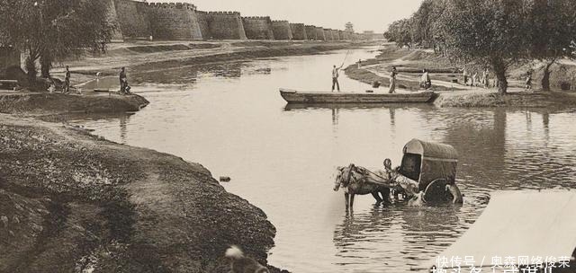 朝阳门北城门外。朝阳城在明清两代都是漕粮运输入口。北京城内官员百姓的粮食大都要从此进入。慈禧太后出逃时,许久无人维护,河道淤积,可以趟水而过。图中百姓瘦的犹如乞丐,十分可怜。