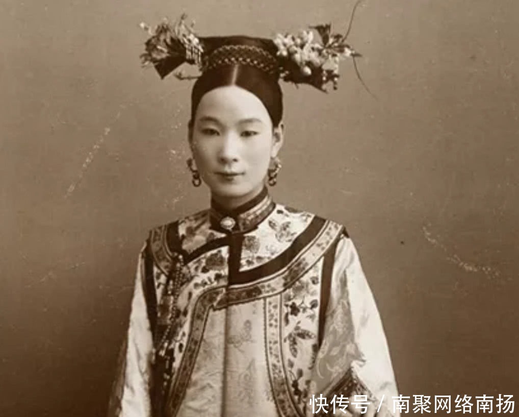图为一组拍摄于晚清1890年前后的人物老照片,这是晚清年间一位朝廷官员家里的正室夫人,这位晚清朝廷官员夫人穿着美丽华贵的锦衣,相貌非常的清秀娴静,戴着满族女子常见的翠玉珠冠旗头,她静默不语的样子非常的好看有气质。