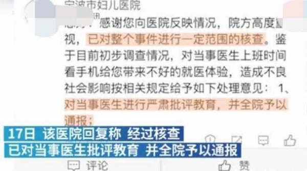 17日,宁波市妇儿医院针对此事,经过核查已对当事医生批评教育,并全院予以通报。通报显示扣罚当事人一个月工资,并暂停一个月门诊诊疗工作,督促其本人做深刻检讨。医院还表示,取消该医生当年评先评优资格。