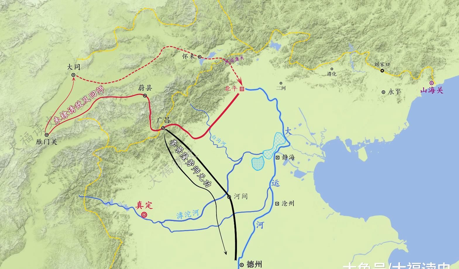败退德州后,李景隆再度调集兵马,准备来春再战燕军。燕王得知后,决定采取攻敌所必救之计,率军西进佯攻大同,吸引朝廷军往援。燕军诸将对朱棣的部署存疑,朱棣回答道,"我征大同,大同必告急于彼以求援。苦寒之地,南卒脆弱不耐,疲于奔命,则冻馁逃散者必多。诱而敝之,何为不可?"是年12月19日,燕军兵抵紫荆关。24日,燕军抵达广昌(涞源)。次年正月初三,燕军攻克蔚县,守将举城投降。初七,燕军攻克雁门关,完成了对大同的战略包围。二月十八日,燕军抵达大同。李景隆听闻燕军攻击大同,忙率军出紫荆关救援。而燕军却悄然自居庸关返回北平。李景隆无功而返,途中"冻馁者甚众"。援救大同之行,使李景隆丧失了休整的时间。待四月份进兵至真定的武安侯郭英和安陆侯吴杰按既定部署开往战场,李景隆也不得不率部自德州北进至白沟河与郭英所部会师。燕王知悉朝廷军的动向后,立即率军南下。双方隔河对峙,激战即将爆发。
