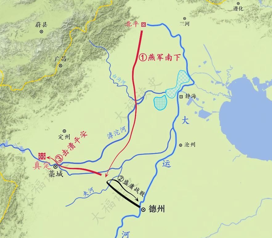 自1399年七月起兵发难至1401年底,燕军已经连续作战两年有余。虽然燕军每战必克,但为集中力量野战对敌,所克城池并未派兵驻守,故而旋得旋失,能始终控制的城池仅限北平、保定、永平三地。纵然朝廷军一再战败,但凭借丰厚的人力物力,不消多久便会卷土重来。长期以往,长期奔驰的燕军根本无暇休整,终将步入困境。此时,应天城中逃出一宦官,声称应天城防空虚可取。燕王首席谋士道衍亦劝燕王舍城勿攻,急趋京师。于是,燕王乃定计奔袭应天。