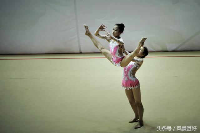 花样体操运动员在配合训练,把搭档顺手托举起来,也需要不小的力气,对两人的默契度和体能是一个考验
