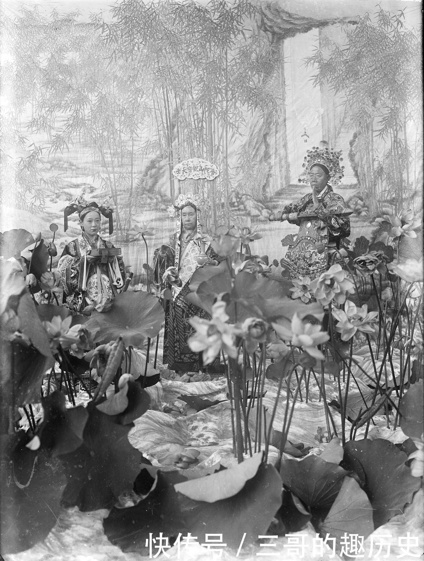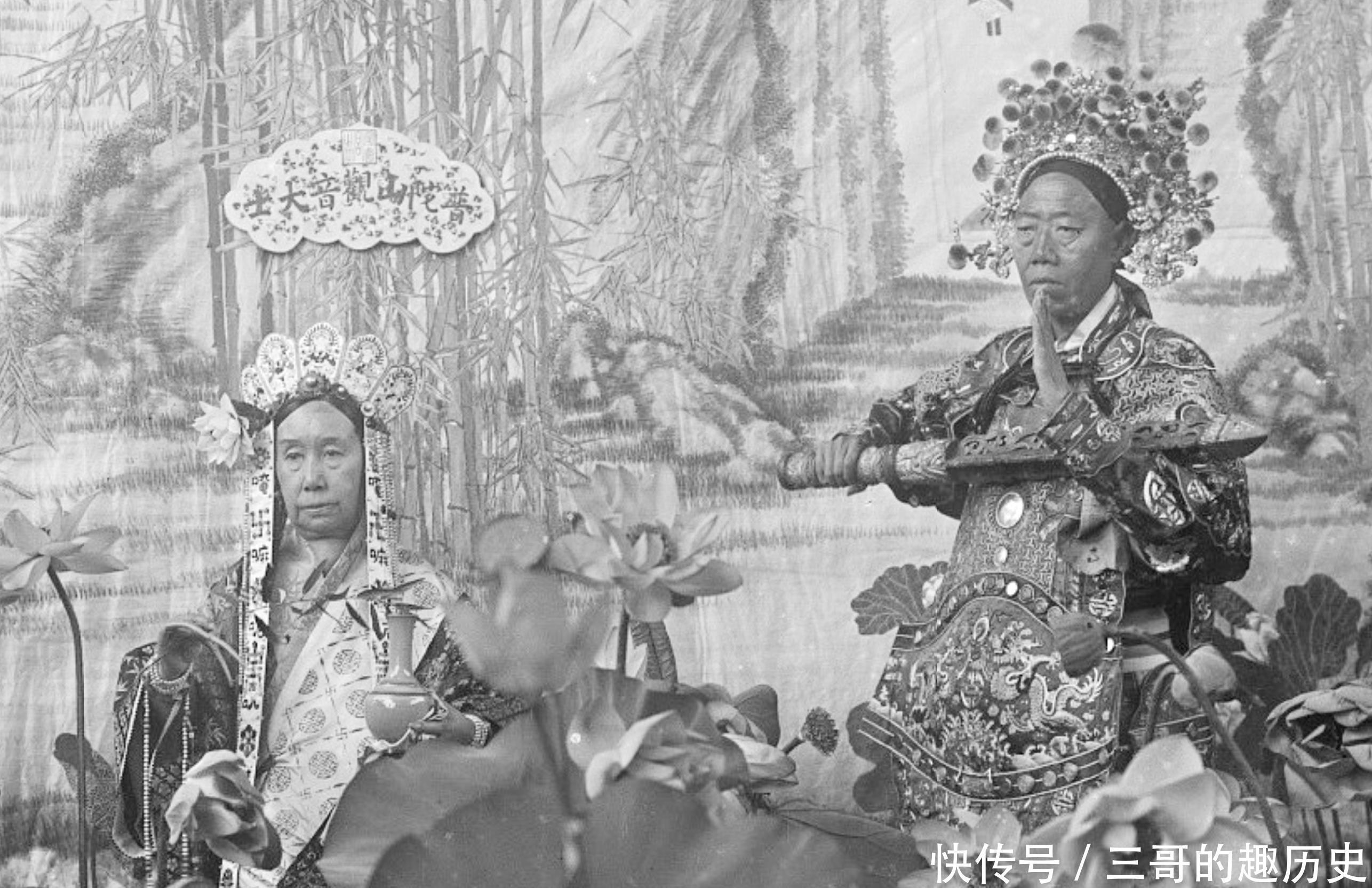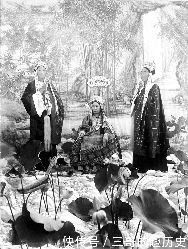 26、这张的慈禧如观音般一手持净水瓶,一手执竹叶枝,正在洒着甘露水,左边的女孩是奕劻的四女儿,称为四格格,深得慈禧宠爱。