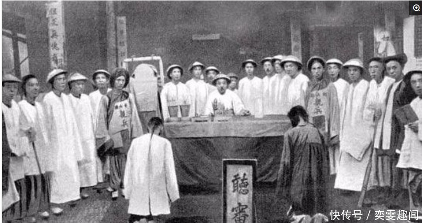 晚清罕见真实老照片:图为晚清一个衙门的官老爷正在升堂审案,后面站着一群官兵,两个犯人跪在堂下不敢抬头。