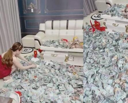 钞票塞满猪腹中的每个角落,最后女子不得不用手将钱抓出来。两只猪全被砸碎后,茶几和地面堆满现金,整个房间都充满了“金钱的味道”。