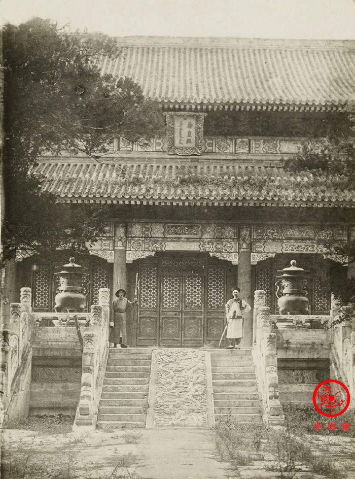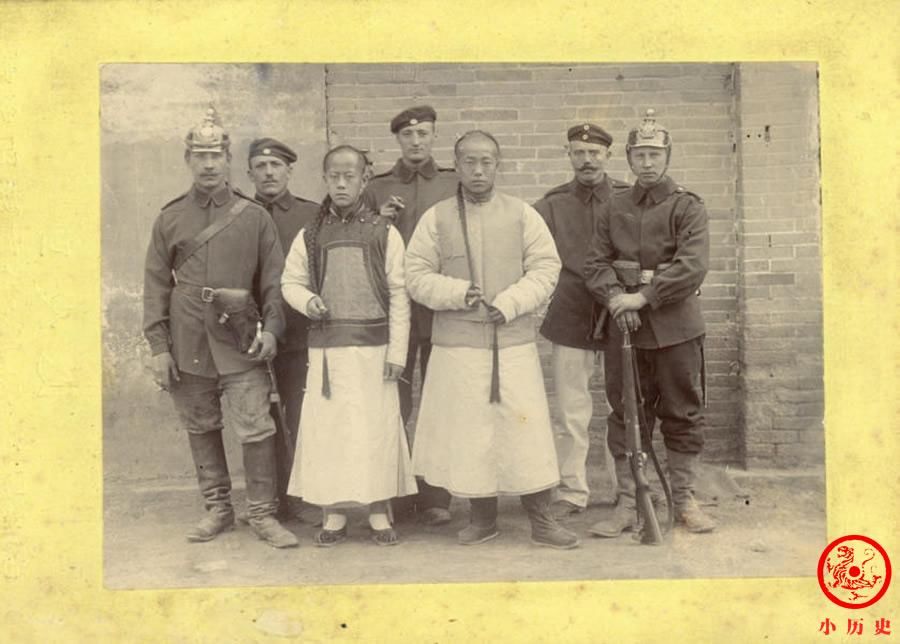 这两名青年手势相同,都拿着自己的发辫。他们很可能是被迫与联军士兵拍照的,而且要展示在外国人看来很奇怪的发辫。