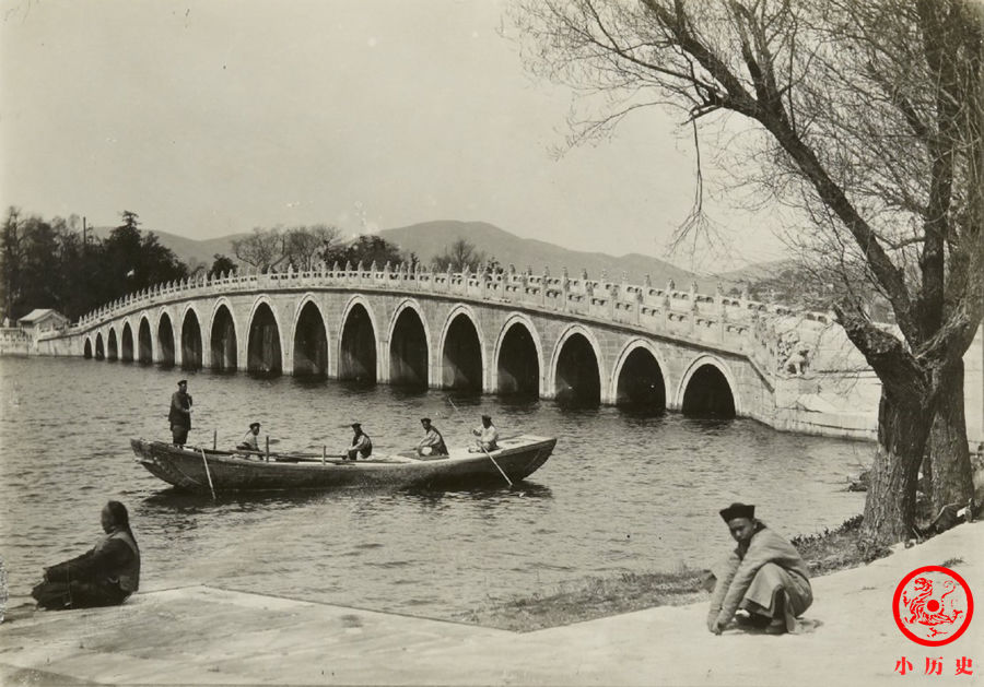 这一处是颐和园内有名的景观之一,几位太监慵懒地蹲在岸边或者泛舟湖面。慈禧太后不在的时候,太监们就没那么紧张。