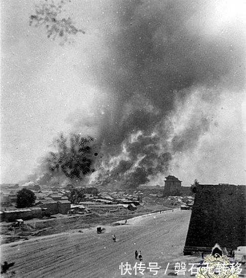 冒着滚滚浓烟的北京城。占领北京后,英法联军在北京近郊持续了50多天的烧杀抢掠,他们还攻入圆明园中,大肆抢掠园中珍宝,带不走的就就地砸坏,清洗一空后,一把大火将其烧掉,大火持续了三天三夜,数百宫女太监丧命。此外清漪园、静明园(玉泉山)、静宜园(香山)、畅春园等均被付之一炬。这场战争,以清政府战败告终,签订了《瑷珲条约》、《天津条约》和《北京条约》,割地赔款,丧权辱国,成为全体中国人心中永远的痛!