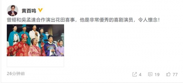 网易娱乐3月1日报道 3月1日,香港演员黄百鸣发文悼念吴孟达,他晒出与吴孟达昔日合作片场旧照,感慨道:“曾经和吴孟达合作演出花田喜事,他是非常优秀的喜剧演员,令人怀念! ”