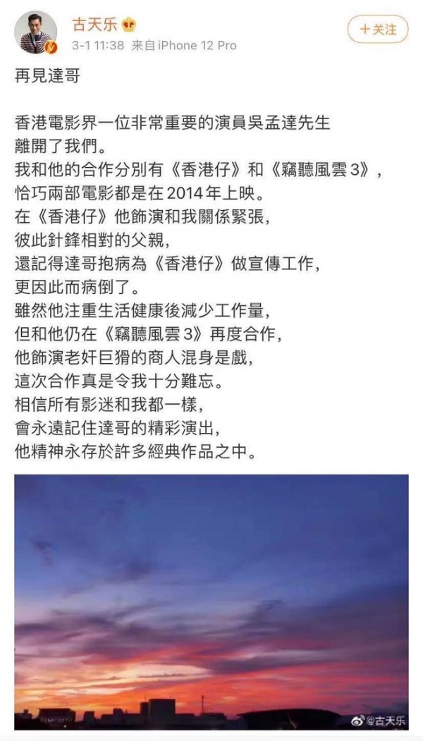 随后,古天乐发表长文《再见达哥》悼念吴孟达,他回忆与达哥曾经合作过的多部作品:“我和他的合作分别有《香港仔》和《窃听风云3》,恰巧两部电影都是在2014年上映。在《香港仔》他饰演和我关系紧张,彼此针锋相对的父亲;在《窃听风云3》再度合作,他饰演老奸巨猾的商人混身是戏,这次合作真是令我十分难忘。”