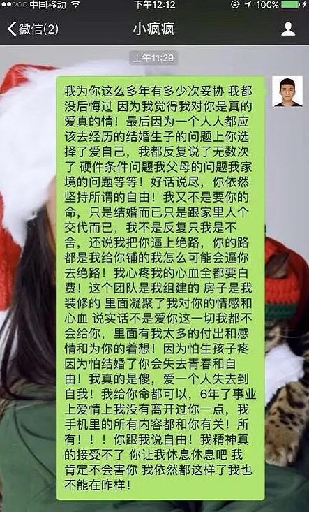 男方还称,“我给你命都可以,6年了事业上爱情上我没有离开过你一点。”