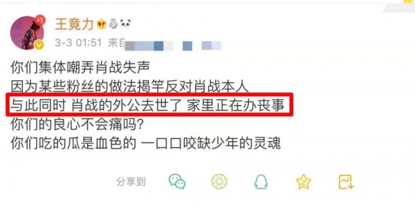 但是这个时候还有人质疑这是他转移视线的炒作,连明日之子选手王竟力都忍不住出来为肖战发声。